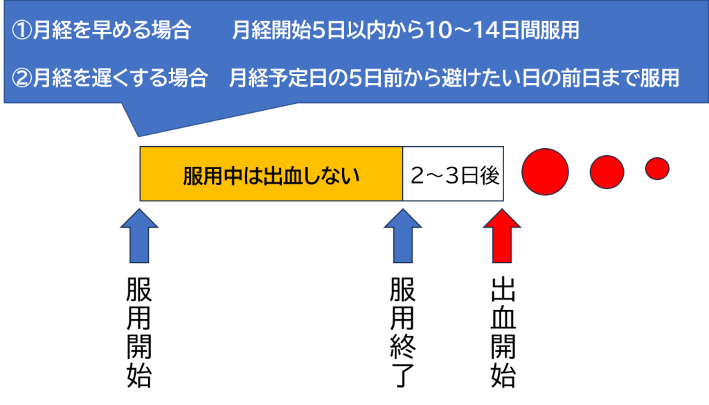 - やり方: 生理予定日の5日ほど前から、「生理を避けたい日」の前日まで毎日飲み続けます。